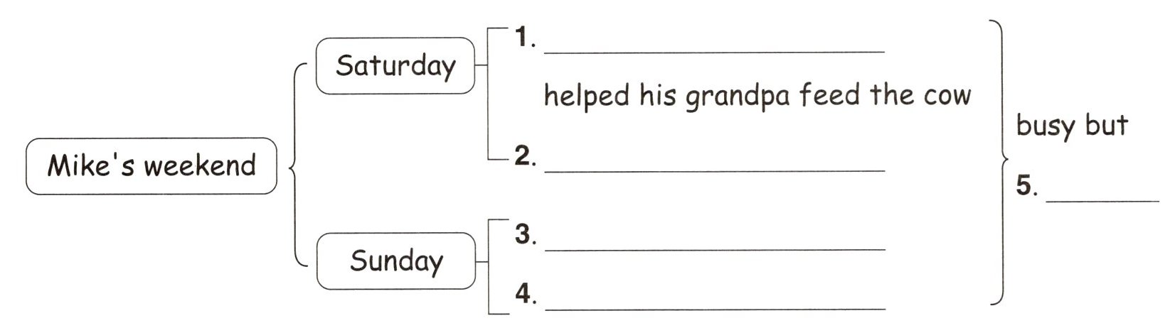 Mike had a busy weekend. He visited his grandparents on Saturday morning. He helped his grandpa feed the cow in the afternoon. He watched a talk show with them in the evening. It was very funny. On Sunday morning, he did his homework. He finished it very quickly because it was easy. In the afternoon, he played basketball with his friends. What a busy but happy weekend!