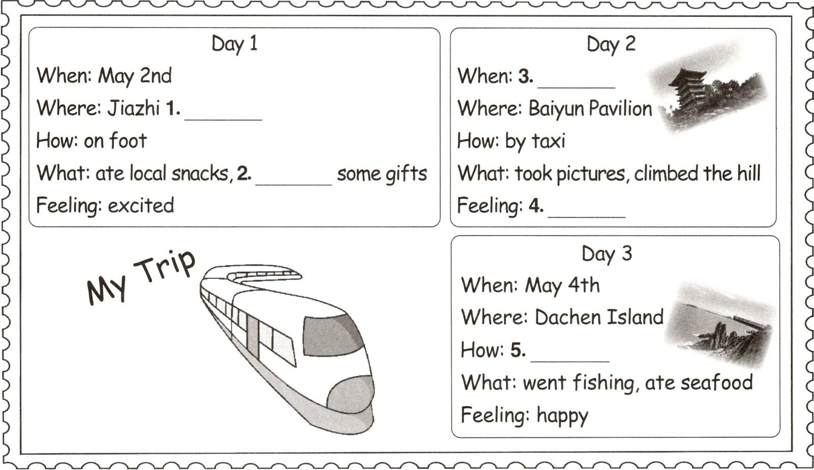 五、 浙江真题 阅读短文,将Betty的旅游手账补充完整。