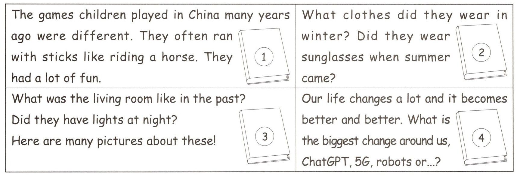 In my first grade, I was little and 1. _______. Everything was new and hard for me. I 2. _______ read well or solve maths problems. I liked 3. _______ games with my friends. Now I am in my 4. _______ grade. I 5. _______ read and do maths homework easily. I have new hobbies like listening to music and drawing. From first grade to sixth grade, I have 6. _______ a lot. I am excited about what will happen next!