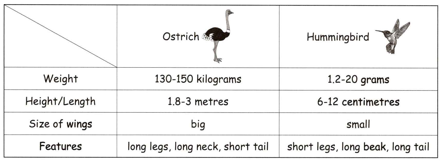 ( ) 1. The hummingbird is much heavier and shorter than the ostrich.