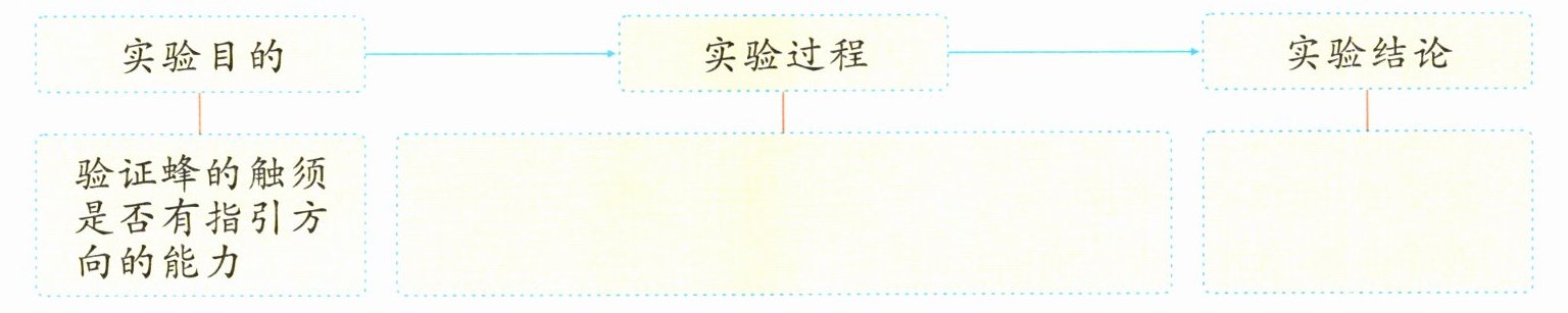 剪去高墙石蜂、节腹泥蜂的触须,将它们送到陌生的地方放掉,观察它们是否能返回蜂巢。@@触须没有指引方向的能力。@@令实验过程更加科学严谨,实验结果更准确。@@示例:能体会到法布尔求真、务实、严谨的科学品格。