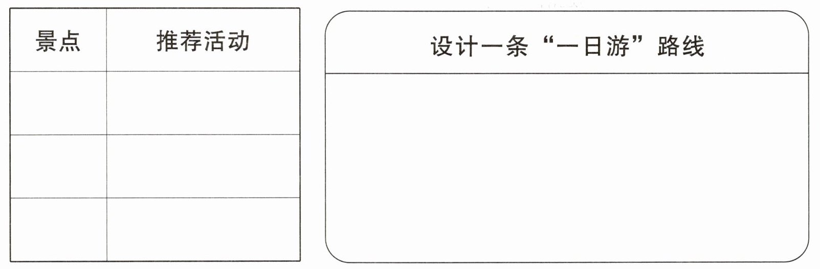 解析:本题考查拓展探究。结合自己的实际情况,选择家乡有特色的景点,按照一定的游览顺序,做一份一日游旅游攻略。注意了解各个景点的位置,设计参观路线最好能经过所有的景点,避免重复路线,恰当使用方位词,使路线更清楚明了;景点的安排要合理有趣,注意各个景点游览的时间安排,避免时间过于紧促。最后,选择路线中最吸引人的地方,简单介绍有趣之处。