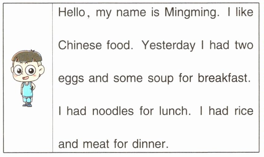 Hello, my name is Mingming. I like Chinese food. Yesterday I had two eggs and some soup for breakfast. I had noodles for lunch. I had rice and meat for dinner.