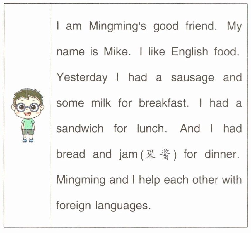 I am Mingming's good friend. My name is Mike. I like English food. Yesterday I had a sausage and some milk for breakfast. I had a sandwich for lunch. And I had bread and jam (果酱) for dinner. Mingming and I help each other with foreign languages.