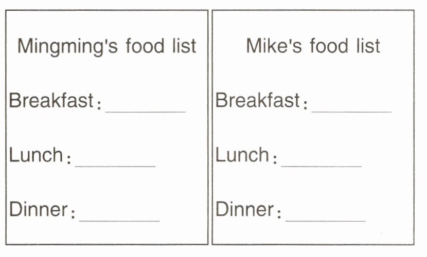 任务二:根据材料内容完成 Mingming 和 Mike 的食物列表。