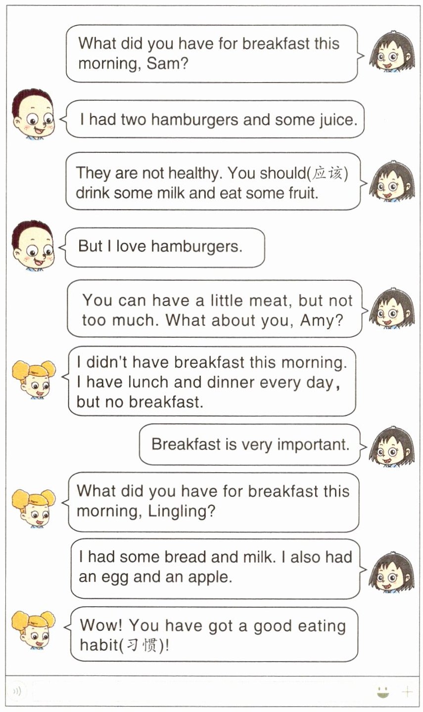 参考词汇:豆浆 soya milk;粥 porridge;包子 baozi