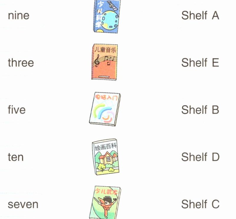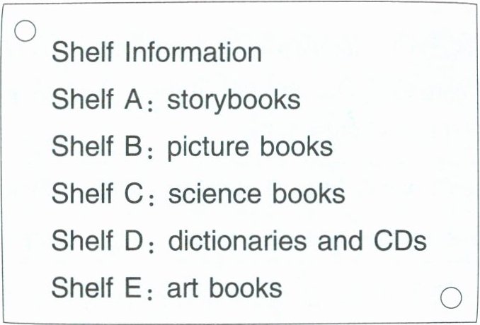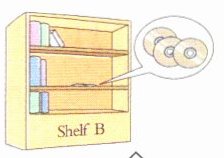 on Shelf B@@Let’s put the science books@@dictionaries@@put them@@They are/They’re on Shelf E.