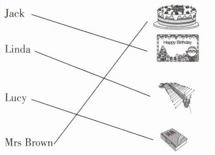 八、(新情境)下周日是 Mr Brown 的生日,他的家人为他准备了哪些礼物呢?来连一连吧!