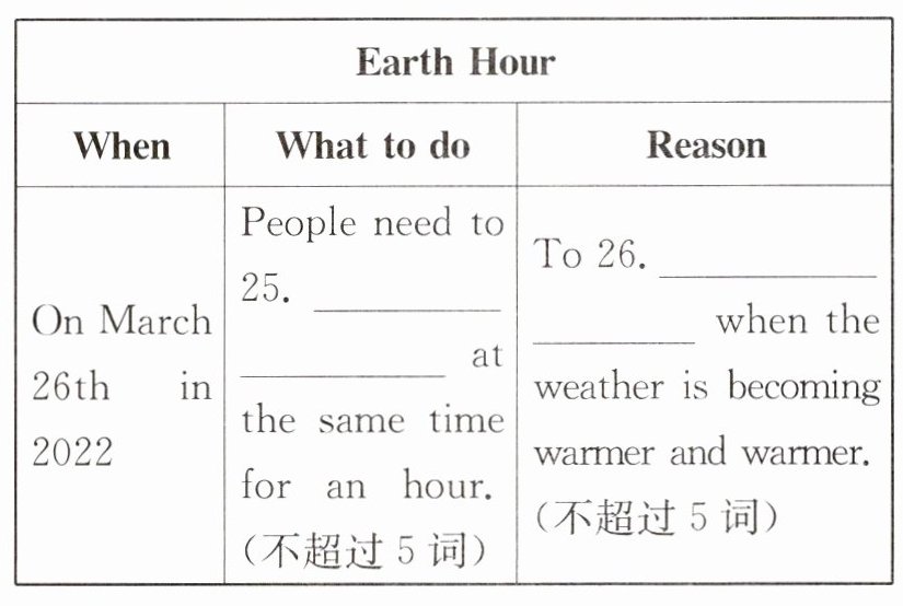turn off electricity@@protect the earth@@there are still other ways for us to protect the earth@@We can find 5/five famous places which take part in Earth Hour.@@We can throw rubbish into the dustbin and save water to protect our earth.(答案合理即可)