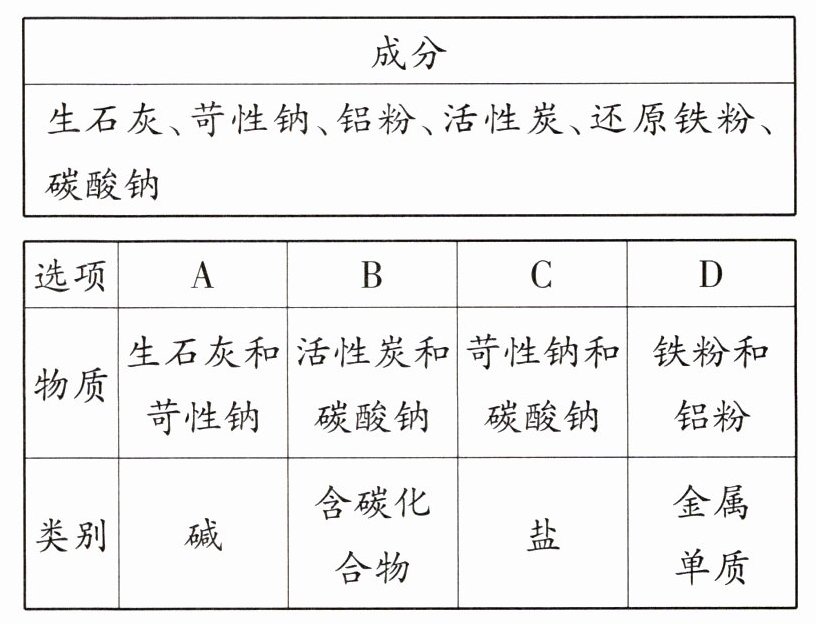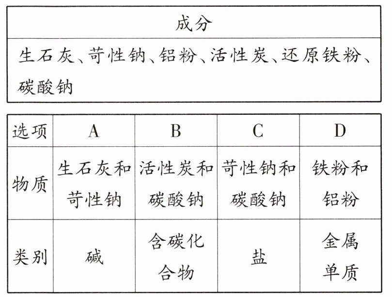 9. (2022安徽9题)某自热火锅的发热包成分标识如下图。下列各组物质所属类别正确的是 ( )
