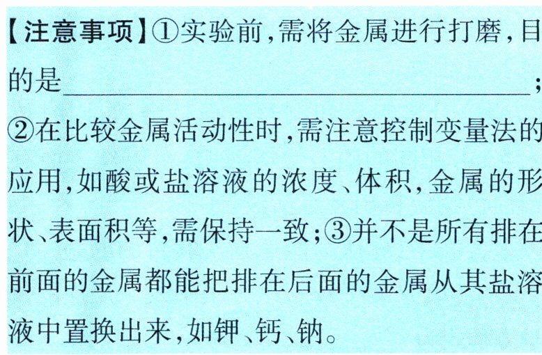 类型2 铁片表面有红色固体析出,溶液由蓝色变为浅绿色 铜片表面有银白色固体析出,溶液由无色变为蓝色 【注意事项】除去金属表面的氧化膜和污物