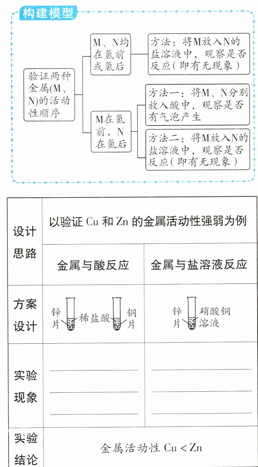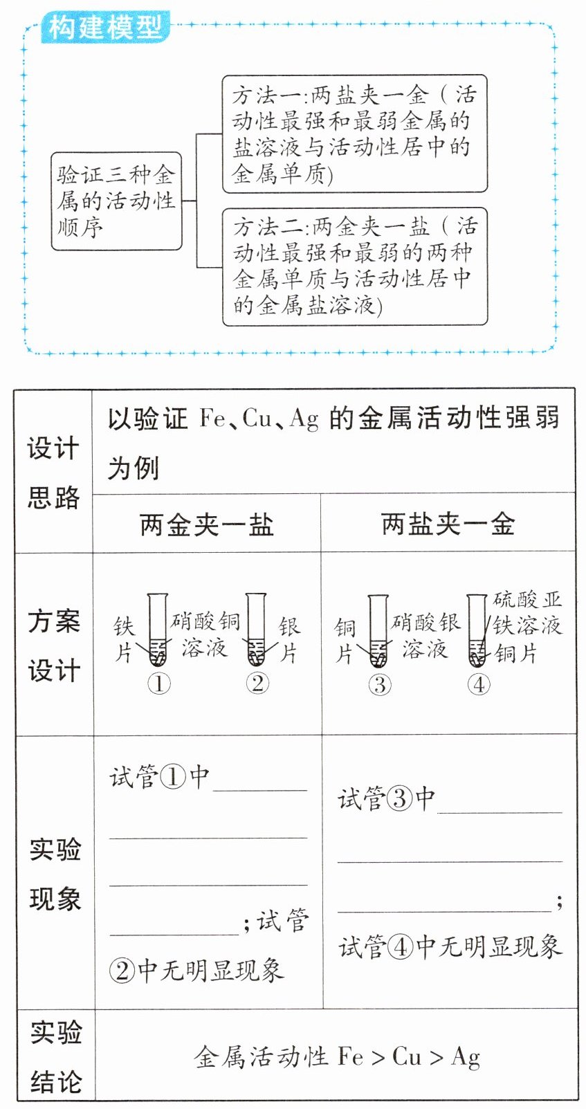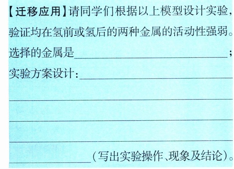 类型1 锌片表面有气泡产生,铜片表面无明显现象 锌片表面有红色固体析出,溶液由蓝色变为无色 【迁移应用】铜和银(合理即可) 将铜片插入硝酸银溶液中,观察到铜片表面有银白色固体析出,溶液由无色变为蓝色,可证明金属活动性:铜>银(或将银片插入硝酸铜溶液中,无明显现象,可证明金属活动性:铜>银,与上一空对应)
