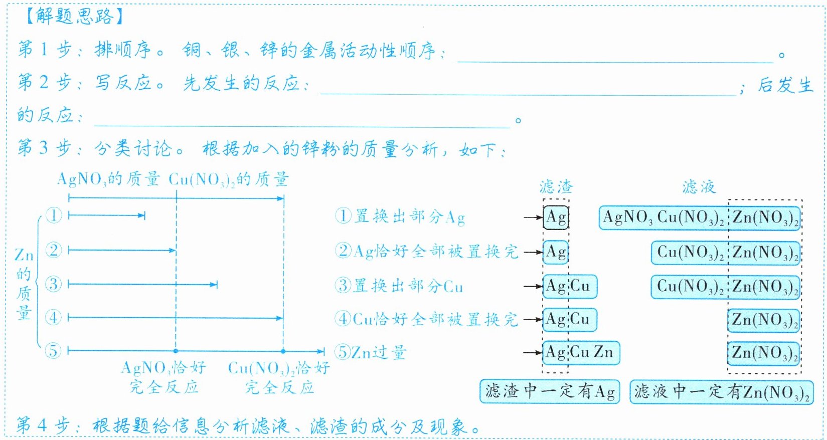 例4 向一定质量Cu(NO₃)₂、AgNO₃的混合溶液中加入一定质量的锌粉,充分反应后过滤,得到滤液和滤渣。下列说法正确的是 ( )