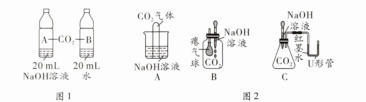 (1)甲组同学设计如图1所示装置,向充满CO₂的A、B两个大小相同的软塑料瓶中分别注入等体积的NaOH溶液和水,立即拧紧瓶塞,振荡,观察到______________________________,证明CO₂与NaOH溶液发生了反应,其中设置B瓶实验的目的是______________________________。