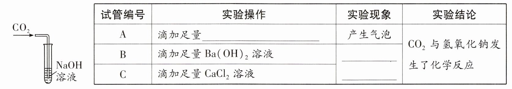 例3 欲验证CO₂与NaOH溶液发生了反应,小明同学取如图所示少量反应后的溶液于A、B、C三支小试管中,进行如下实验,请将实验过程补充完整。