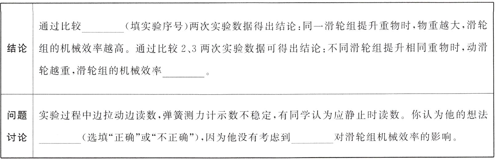 通过比较2、3两次实验数据可知,用乙、丙滑轮组提升相同的重物时,因为丙滑轮组有两个动滑轮,动滑轮越重,克服动滑轮所做的额外功越多,机械效率越低。由此可得出结论:不同滑轮组提升相同重物时,动滑轮越重,机械效率越低。