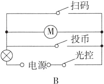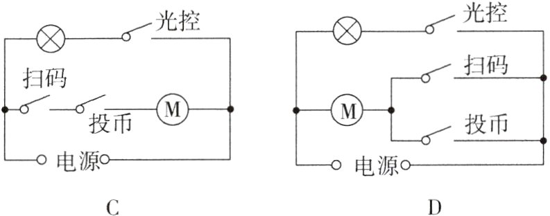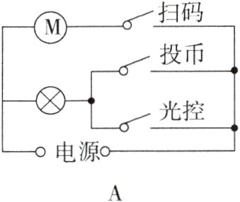 3.(2024·广安)党的二十大报告指出“必须坚持科技是第一生产力”。某学校为了培养学生的科学素养,开展了STEM科创教育,在此期间,科创小组自制了“冰淇淋自动售货机”。该作品可以通过扫码(该开关闭合)或投币(该开关闭合)完成自动出售服务;当光线较暗时,光控开关闭合,还可以提供照明。下列电路设计符合该要求的是( )