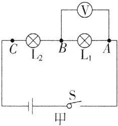 (3)用电压表分别测出电压$U_{AB}、$$U_{BC}$和$U_{AC}。$其中测$U_{AB}$时,电压表的示数如图丙所示,示数为__________V。接着更换不同规格的灯泡并多次实验,数据记录见表;