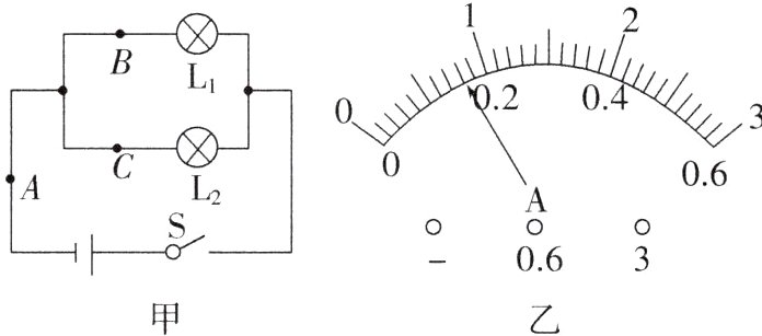 (4)小华在某次实验时,测得C处电流$I_{C}$为0.30A,观察到A处电流表指针位置如图乙所示,则A处电流大小为________A。