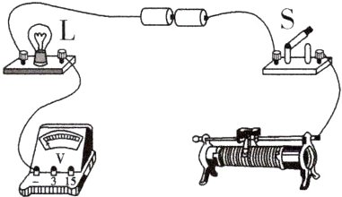 3. 在如图所示的电路中,有两根导线尚未连接,请用笔画线代替导线补上。要求:(1)闭合电键S后,向左移动滑动变阻器的滑片P,小灯变暗;(2)电压表测量滑动变阻器两端的电压。