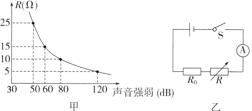 7.(2024·四川)噪声污染是当代社会四大污染之一,若青少年长期处于噪声环境中会影响身心健康。为了监测噪声的强弱,同学们找来定值电阻$R_{0}、$声敏电阻R(阻值会随声音强弱发生变化)、电流表、学生电源等器材,设计了可用电流表的示数来反映噪声强弱的装置,其中R的阻值随声音强弱变化的关系如图甲所示,该装置电路如图乙所示。在某次测试中,当噪声80 dB时,电流表示数为0.4 A;当噪声50 dB时,电流表示数为0.2 A。下列选项正确的是( )