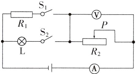 【典例2】 如图所示,电源电压保持9 V不变,灯泡L的额定功率为3 W,额定电压为6 V,电阻$R_1 = 20 \Omega$。只闭合$S_2$,将滑动变阻器的滑片P移到中点时,电流表的示数为0.3 A。(不考虑温度对灯丝电阻的影响,计算结果保留两位小数)