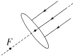 3.(2024·安徽)据晋代张华的《博物志》记载:“削冰令圆,举以向日,以艾承其影,则得火。”这种利用冰透镜向日取火的方法,体现了我国古代劳动人民的智慧。如图所示,若把冰块制成的凸透镜正对着太阳,将太阳光看成平行光,冰透镜的焦点为F,请在图中完成光路。