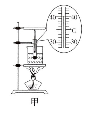 【解析】 (1)酒精灯需用外焰加热,所以先放好酒精灯,再固定铁圈的高度,然后调整试管的高度,让试管装有海波的部分浸没在水中,最后调整温度计的高度,使其不要碰到容器底,所以要按照自下而上的顺序进行;装有海波的试管浸没在水中进行实验是为了让海波受热均匀;(2)如图乙,在第3 min时海波处于熔化前,是固态;若在第10 min时将装有海波的试管从热水中取出置于空气中,海波不能继续吸收热量,则不能继续熔化。