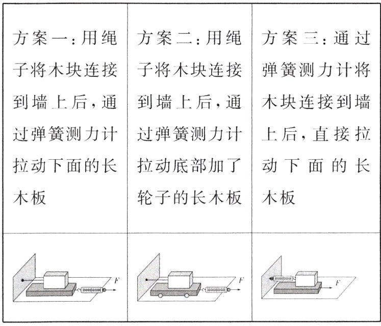 (4)小成发现匀速拉动木块时,不好控制且不方便读数,于是爱思考的她利用木块静止时二力平衡的特点,设计了改进方案(如下表所示),你认为应该采用哪个方案?答:________