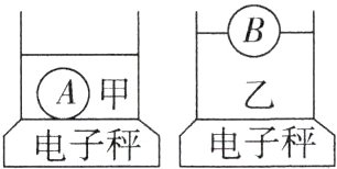 3.(2024·达州)如图所示,水平桌面上两相同电子秤,上面分别放有相同的圆柱形容器,容器中装有甲、乙两种不同的液体,将体积相等的A、B两个小球分别放入液体中静止时,A球沉底、B球漂浮,此时液体深度$h_{甲}<h_{乙}$,液体对容器底部压强相等。下列说法正确的是 ( )