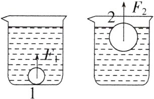 6.(2022·赤峰)放在水平桌面上的两个相同的烧杯中装有不同浓度的盐水,其中一杯是饱和的。盐水中的实心小球是用同种材料制作的。小球静止时情况如图所示,此时小球1、小球2受到的浮力分别记为$F_{1}$、$F_{2}$。向两个烧杯中分别加入少许质量相等的盐后(盐的体积忽略不计),发现小球1依然静止在烧杯底,小球2还是处于漂浮状态。此时小球1、小球2两个小球受到的浮力分别记为$F_{1}'$、$F_{2}'$。整个过程温度不变,可推断出 ( )