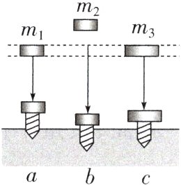 3. 用“模拟打桩”来探究物体重力势能的大小与哪些因素有关,物体的质量$m_1 = m_2 < m_3$,实验时,让物体从木桩正上方的某一高度处自由下落,将木桩打入沙中,三次实验木桩进入沙中的深度如图所示,木桩进入沙中的深度越深,则物体对木桩做的功越_______,比较a、b可知:物体重力势能的大小与物体的_______有关;比较_______可知:物体重力势能的大小与物体的质量有关。