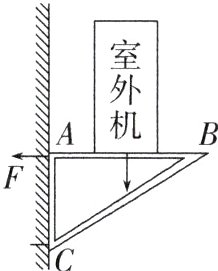 [解析] 由勾股定理可得,AC = $\sqrt{BC^{2}-AB^{2}}=\sqrt{(50\ cm)^{2}-(40\ cm)^{2}} = 30\ cm$。由题意可知,以C为支点,ABC是一个杠杆。AC为A处螺钉水平拉力的力臂,室外机对其压力的力臂为AB长的$\frac{1}{2}$,由杠杆平衡条件可得F×AC = G×$\frac{1}{2}$AB,即F×30 cm = 300 N×$\frac{1}{2}$×40 cm,解得F = 200 N;为了安全,应减小A处的拉力(若拉力过大,支架对螺钉拉力会使螺钉松动而造成危险),在A处力臂和阻力G一定时,室外机的位置越靠近墙壁,室外机对支架压力力臂越小,根据杠杆平衡条件可知,A处的拉力将减小,以保证支架和室外机的安全。