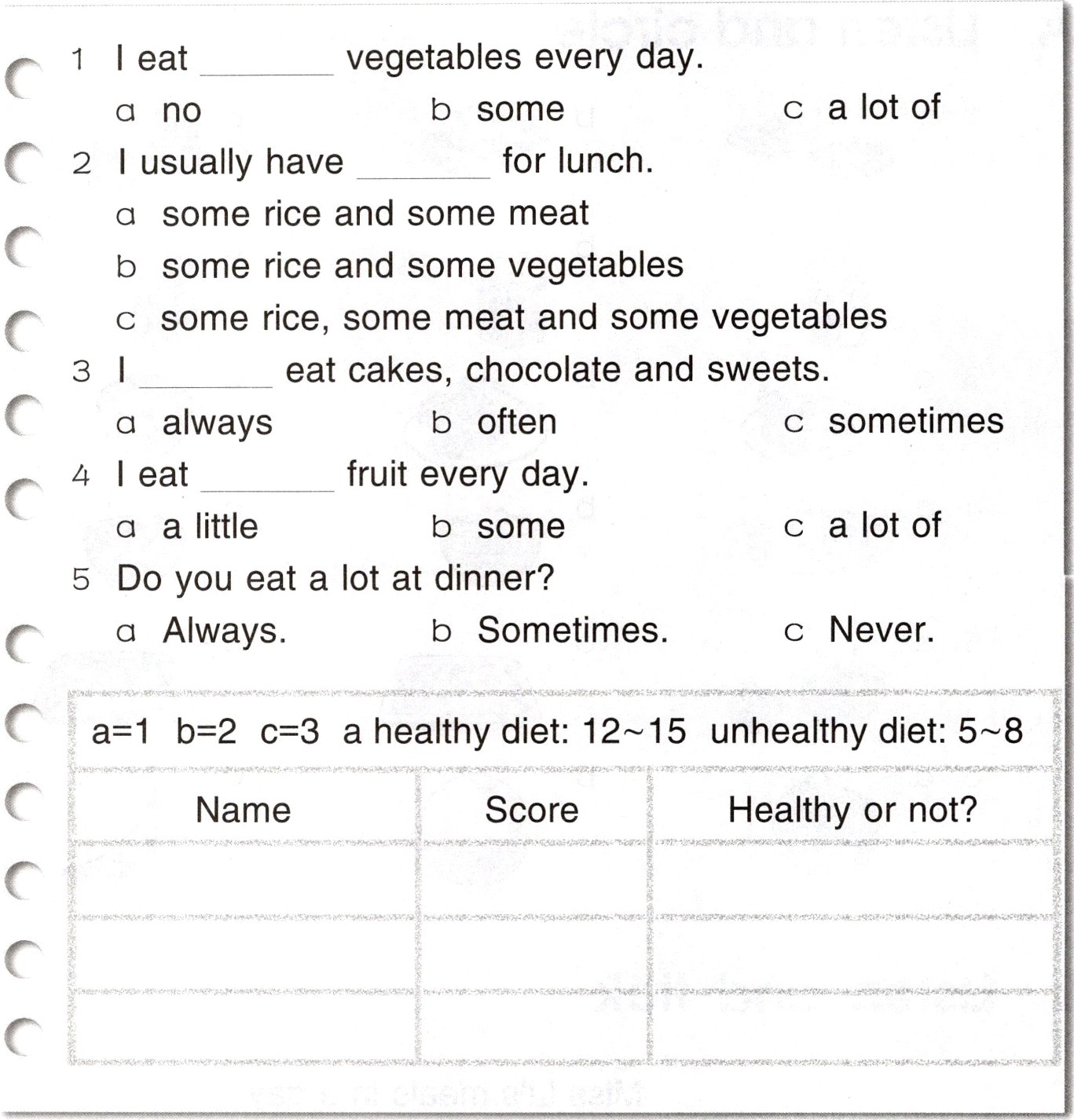 I eat ... vegetables every day. I usually have ... for lunch. I ... cakes, chocolate and sweets. I eat ... fruit every day. I ... eat a lot at dinner. My score is ... I have a/an ... diet. My friend ...