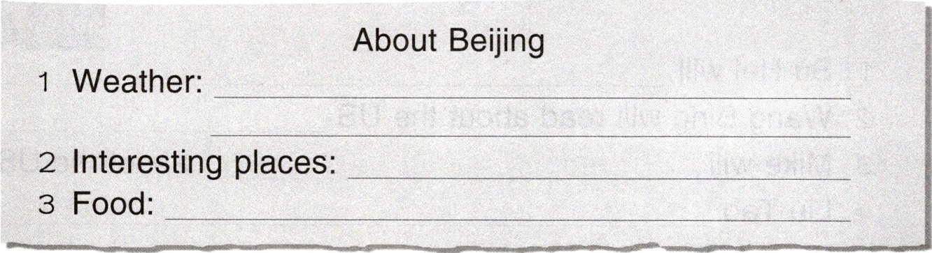You will find a lot of yummy and interesting food in Beijing. Beijing Roast Duck is very famous and delicious (美味的). Many snacks are very nice too.