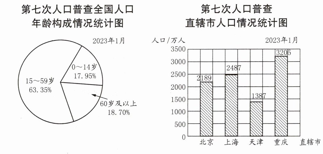 (1)第七次人口普查,直辖市中,( )的人口最多,是从( )统计图中知道的;年龄范围为( )岁的人口最多,是从( )统计图中知道的。