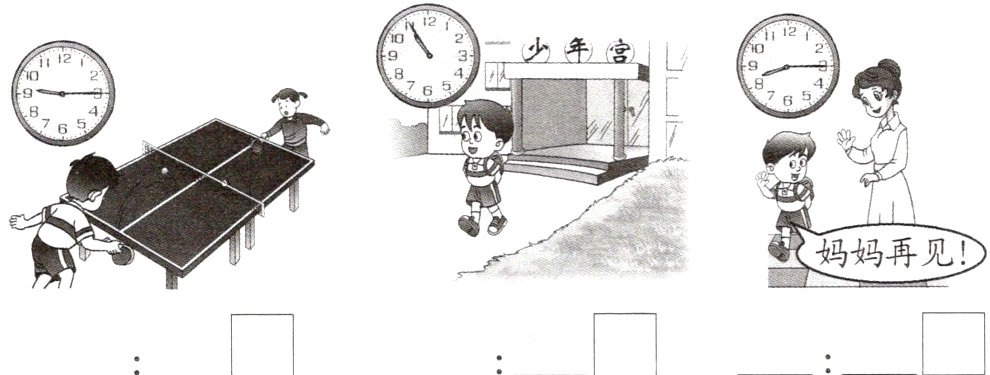 3. 星期天,南南去少年宫打乒乓球,先写出钟面上的时间,再按时间顺序给三幅图编号。