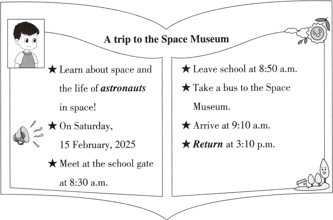 David is going to visit the Space Museum with his classmates next week. He is so happy that he can’t sleep well the whole week. Here is the poster about their trip plan.