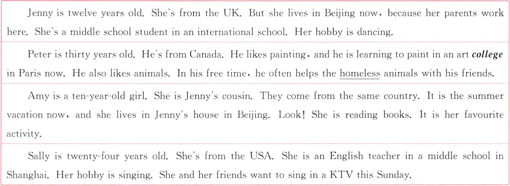 5. A 细节理解题。根据第二栏第二句“He’s from Canada.”可知,彼得来自加拿大,而不是来自法国。