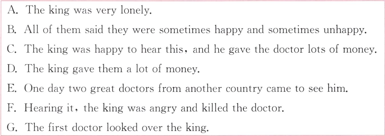 The doctors in his country couldn’t cure him, so the king was angry with them. 1. ________ The king said to them, “If you can cure me and make me happy, I’ll give you a lot of money.”