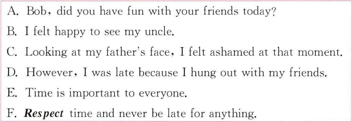 5. F 根据前文“What you did was not very nice and you should be sorry for your action.”可知,作者应该为他的行为感到抱歉,由此推测,作者的父亲告诉他要尊重时间,做任何事都不能迟到。