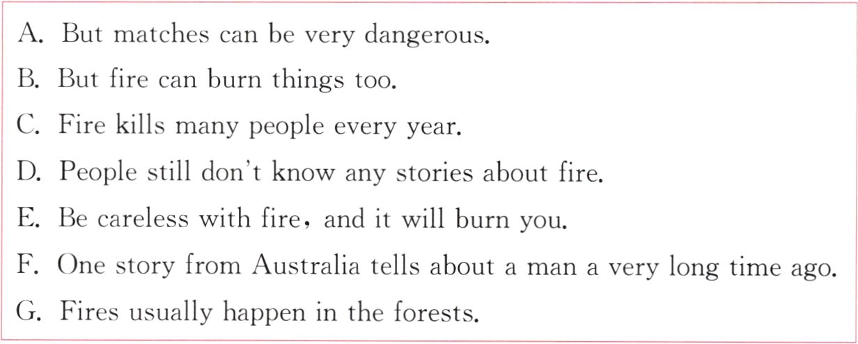 Fire can help people in many ways. But it can also be very harmful. Fire can heat water, warm our houses, give light and cook food. 1.______ It can burn trees and houses. Sometimes big fires can burn forests. Nobody knows how people began to use fire. But there are many interesting old stories about the first time people started a fire. 2.______ He went up to the sun by a rope and brought fire down.