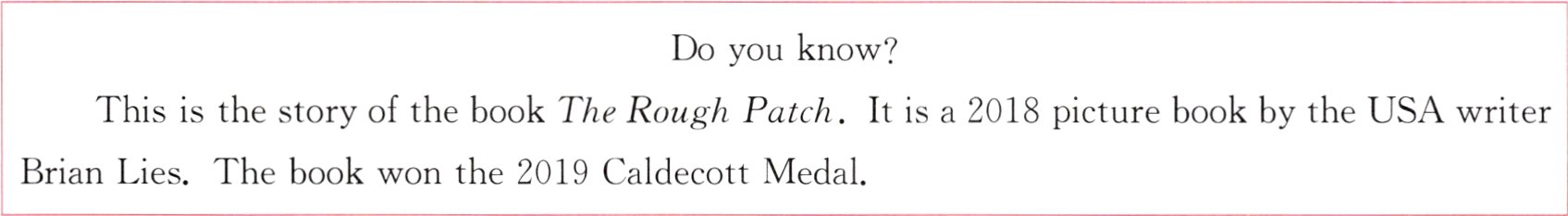 5. C 推理判断题。根据方框中的信息“This is the story of the book The Rough Patch. It is a 2018 picture book by the USA writer Brian Lies.”可知,文章介绍了绘本《粗糙的补丁》的故事。