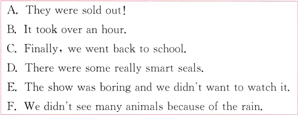 When we arrived at the zoo, we were all tired and hungry. We wanted to see dolphins, but there weren't any. 2. ________ We didn't see the show because we arrived too late. We forgot our cameras, so we didn't take any photos. Then it started to rain. No one had an umbrella. 3. ________ Then we went for lunch. We ate hamburgers. My friends also had some ice cream, but I didn't have any, because I didn't like it. I wanted French fries, but there weren't any in the shop. 4. ________