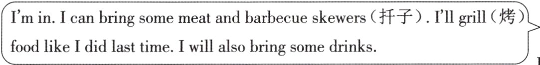 I'm in. I can bring some meat and barbecue skewers(扦子). I'll grill(烤) food like I did last time. I will also bring some drinks.