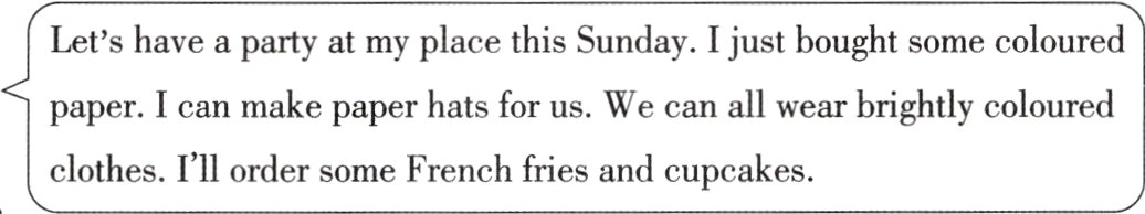 Let's have a party at my place this Sunday. I just bought some coloured paper. I can make paper hats for us. We can all wear brightly coloured clothes. I'll order some French fries and cupcakes.