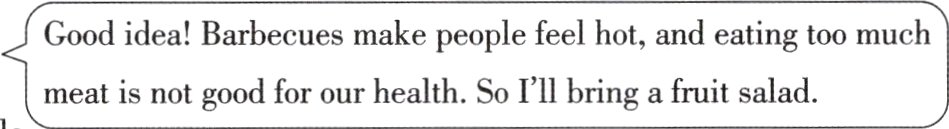 Good idea! Barbecues make people feel hot, and eating too much meat is not good for our health. So I'll bring a fruit salad.