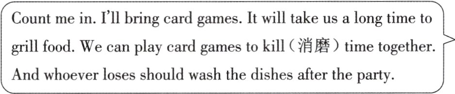 Count me in. I'll bring card games. It will take us a long time to grill food. We can play card games to kill(消磨) time together. And whoever loses should wash the dishes after the party.