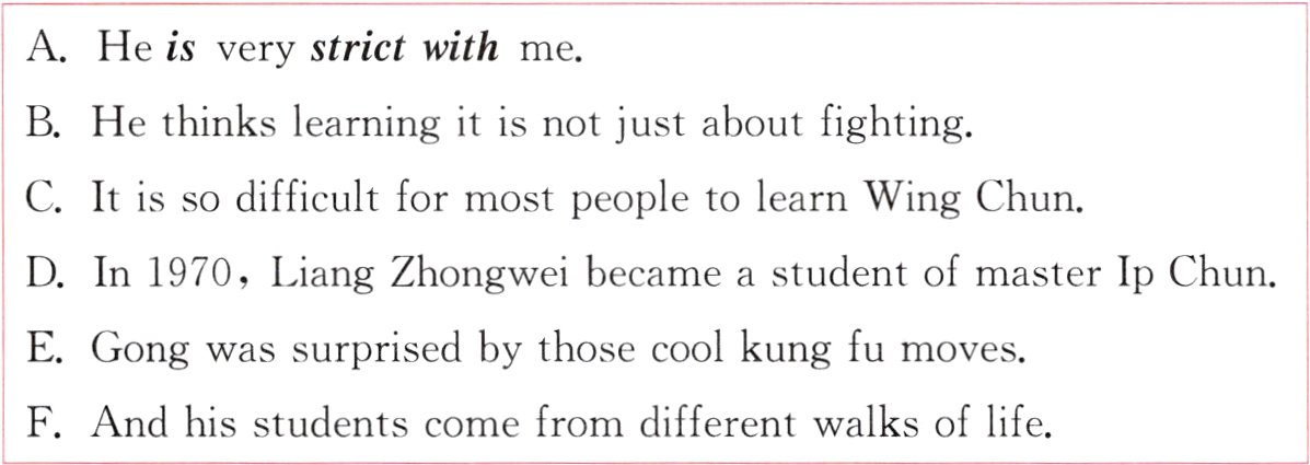 4. E 根据前后句可知,他和父母一起看了电影《叶问》之后决定学习咏春拳。故E项符合语境。