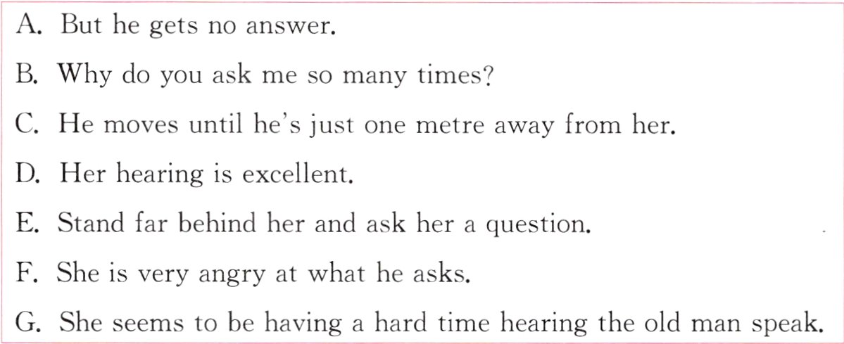 An old man goes to a doctor to ask some questions about his wife’s hearing. 1. ______ He’s worried that she is going deaf. The doctor suggests a test to find out how bad her hearing is.